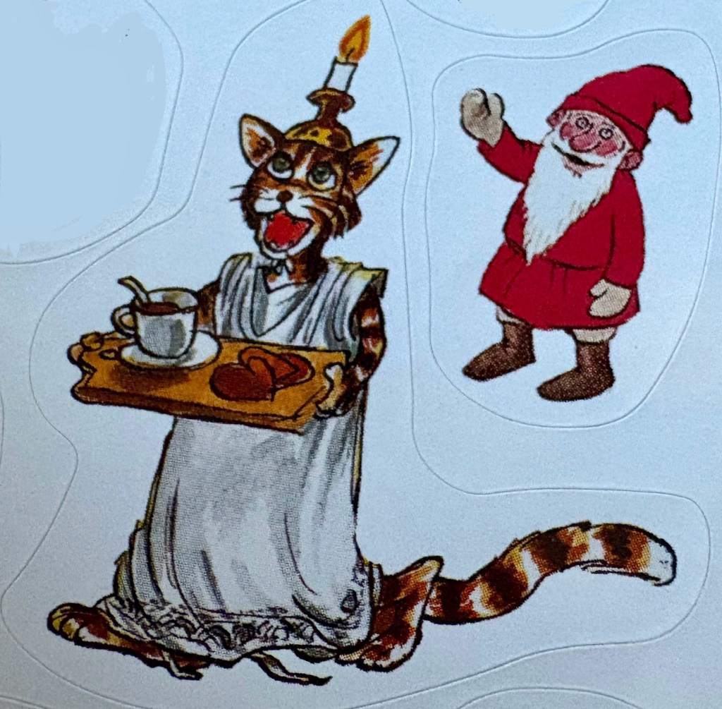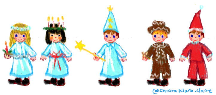 Other children are pepparkaksgubbar (gingerbread men) and tomtenissar (Christmas elves). Lucia songs as are sung, as Natten går tunga fjät “the night comes heavily”. It is actually based off a song by a Neapolitan composer.